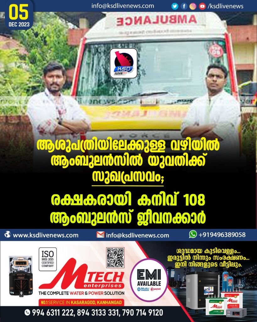 ആശുപത്രിയിലേക്കുള്ള വഴിയിൽ ആംബുലൻസിൽ യുവതിക്ക് സുഖപ്രസവം; രക്ഷകരായി കനിവ് 108 ആംബുലൻസ് ജീവനക്കാർ