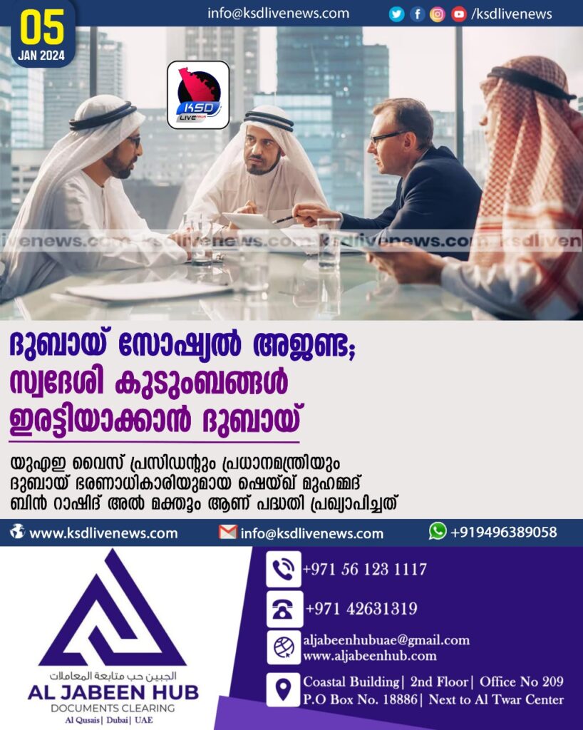 സ്വദേശികളുടെ ജീവിത, ഭവന നിലവാരം, ആരോഗ്യ പരിരക്ഷ എന്നിവ വർധിപ്പിക്കാനുള്ള പദ്ധതികൾ ആവിഷ്‌കരിച്ച് നടപ്പാക്കാനായി 20,800 കോടി ദിർഹത്തിന്റെ പദ്ധതിക്കും രൂപം നൽകി. കുടുംബം രാഷ്ട്രത്തിന്റെ അടിത്തറ എന്ന മുദ്രാവാക്യത്തോടെ ആവിഷ്കരിച്ച ദുബായ് സോഷ്യൽ അജൻഡയിലൂടെ ലോകത്തിലെ ഏറ്റവും മികച്ച പാർപ്പിടവും മറ്റു സൗകര്യങ്ങളും സ്വദേശി കുടുംബങ്ങൾക്ക് ലഭ്യമാക്കുമെന്നും അദ്ദേഹം പറഞ്ഞു.