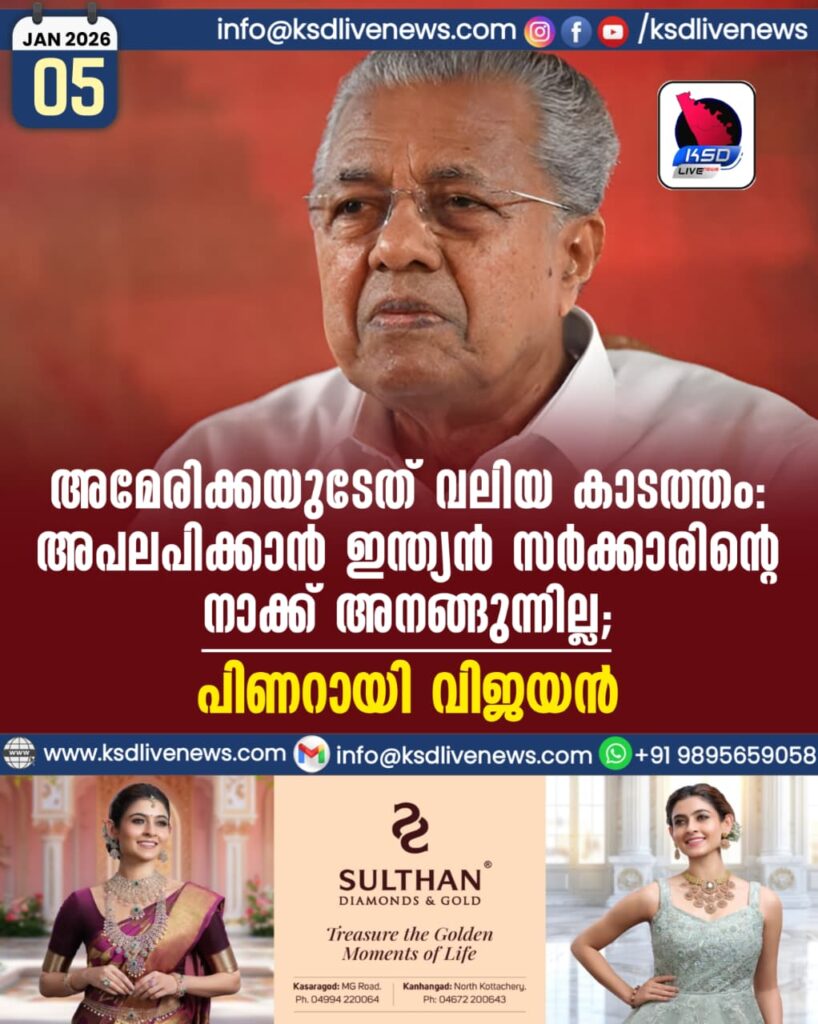 തിരുവനന്തപുരം: വെനസ്വേലയിലുണ്ടായത് ഏറ്റവും നികൃഷ്ടമായ ഇടപെടലെന്നും അമേരിക്ക നടത്തിയത് വലിയ കാടത്തമെന്നും മുഖ്യമന്ത്രി പിണറായി വിജയൻ. ഒരു രാഷ്ട്രവും മറ്റൊരു രാഷ്ട്രത്തിനെതിരേ അനാവശ്യമായി യുദ്ധം നടത്താൻ പാടില്ല. എത്ര വലിയ തെമ്മാടിത്തമാണിത്, എവിടെയാണ് രാജ്യത്തിന്റെ സ്വാതന്ത്ര്യം, എവിടെയാണ് രാജ്യത്തിന്റെ പരമാധികാരമെന്നും മുഖ്യമന്ത്രി ചോദിച്ചു. വെനസ്വേലയിലെ അമേരിക്കൻ സാമ്രാജ്യത്വത്തിന്റെ ആക്രമണത്തെ അപലപിക്കാൻ ഇന്ത്യൻ സർക്കാരിന് കഴിയുന്നില്ലെന്നും അദ്ദേഹം കുറ്റപ്പെടുത്തി.