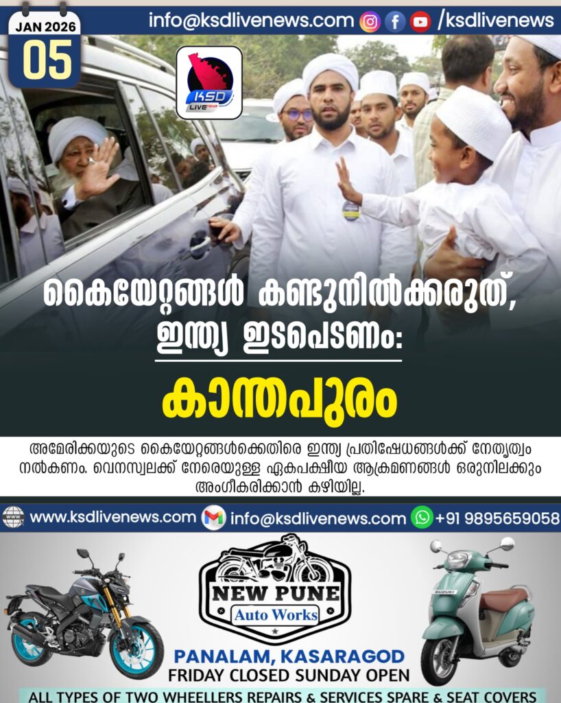 കോഴിക്കോട്: സ്വതന്ത്ര പരമാധികാരരാഷ്ട്രങ്ങള്‍ക്കെതിരെയുള്ള അമേരിക്കയുടെ കൈയേറ്റങ്ങളെ ലോകം കൈയുംകെട്ടി നോക്കി നില്‍ക്കരുതെന്ന് കാന്തപുരം എ പി അബൂബക്കര്‍ മുസ്‌ലിയാര്‍. ഇന്ത്യ ഇതിനെതിരായി ശബ്ദിക്കണമെന്നും കാന്തപുരം ആവശ്യപ്പെട്ടു. മുതലക്കുളത്ത് കേരള യാത്രക്ക് നല്‍കിയ സ്വീകരണത്തില്‍ സംസാരിക്കുകയായിരുന്നു അദ്ദേഹം.