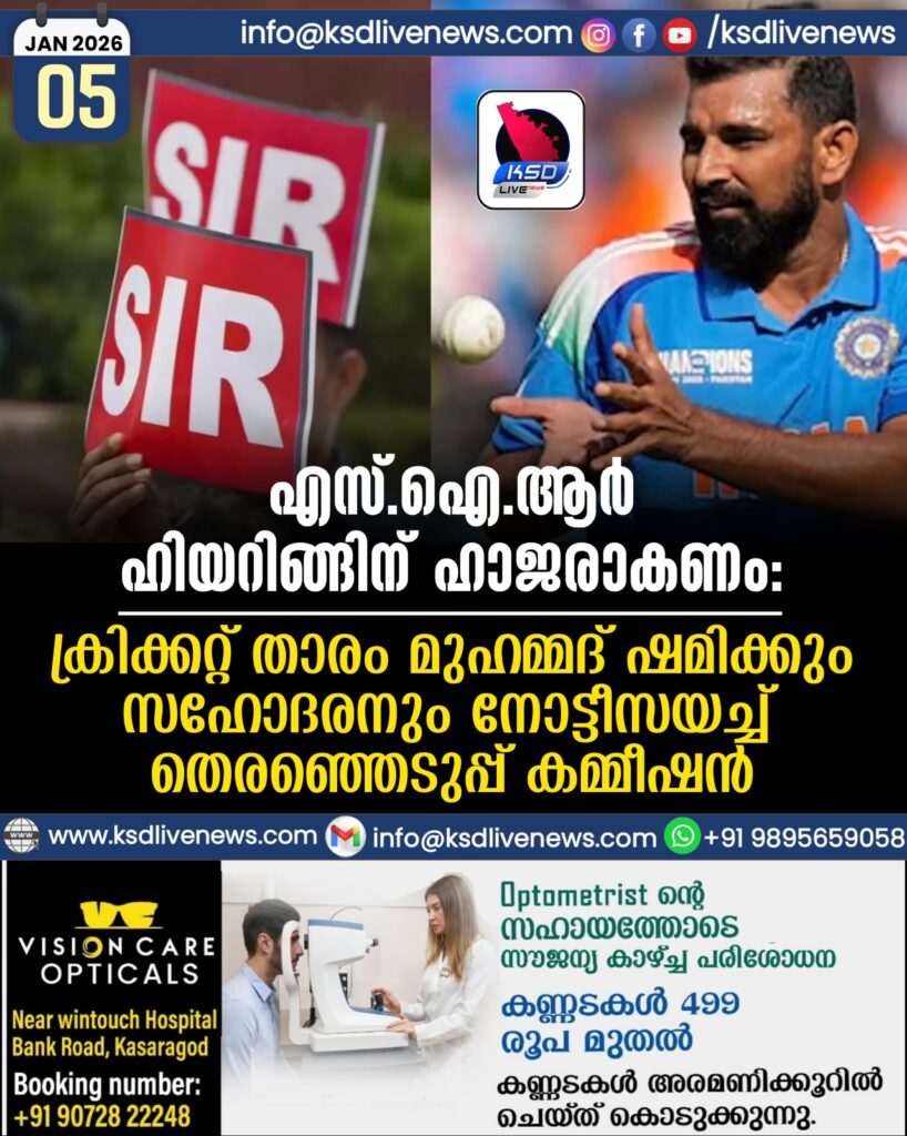 ന്യൂഡൽഹി: എസ്ഐആറുമായി ബന്ധപ്പെട്ട ഹിയറിങ്ങിന് ഹാജരാകാൻ ക്രിക്കറ്റ് താരം മുഹമ്മദ് ഷമിക്കും സഹോദരനും തെരഞ്ഞെടുപ്പ് കമ്മീഷൻ നോട്ടീസ്. കൊൽക്കത്തയിലെ ജാദവ്പൂരിലെ സ്കൂളിൽ തിങ്കളാഴ്ച ഹാജരാകാൻ ആണ് നിർദേശം. എന്യൂമറേഷൻ ഫോമുകളിലെ തിരുത്തുമായി ബന്ധപ്പെട്ട പരാതിയിലാണ് ഹിയറിങ്. വിജയ് ഹസാരെ ട്രോഫിക്കായി രാജ്കോട്ടിൽ ഉള്ളതിനാൽ ഹാജരാകാൻ കഴിയില്ലെന്ന് ഷമി തിരഞ്ഞെടുപ്പ് കമ്മീഷണർക്ക് അറിയിച്ചു.