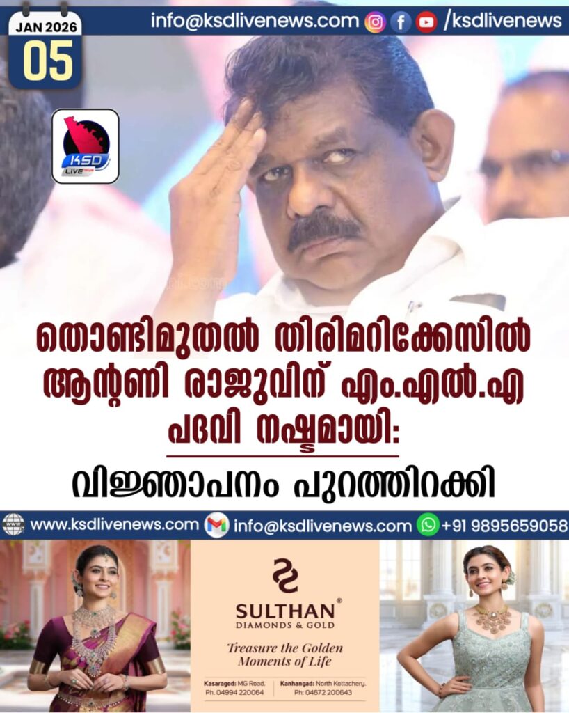തൊണ്ടിമുതൽ തിരിമറിക്കേസിൽ ആന്റണി രാജുവിന് എംഎൽഎ പദവി നഷ്ടമായി; വിജ്ഞാപനം പുറത്തിറക്കി