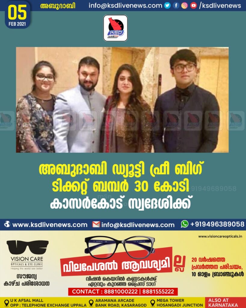 അബുദാബി ഡ്യൂട്ടി ഫ്രീ ബിഗ് ടിക്കറ്റ് ബമ്പർ 30 കോടി കാസർകോട് സ്വദേശിക്ക്‌