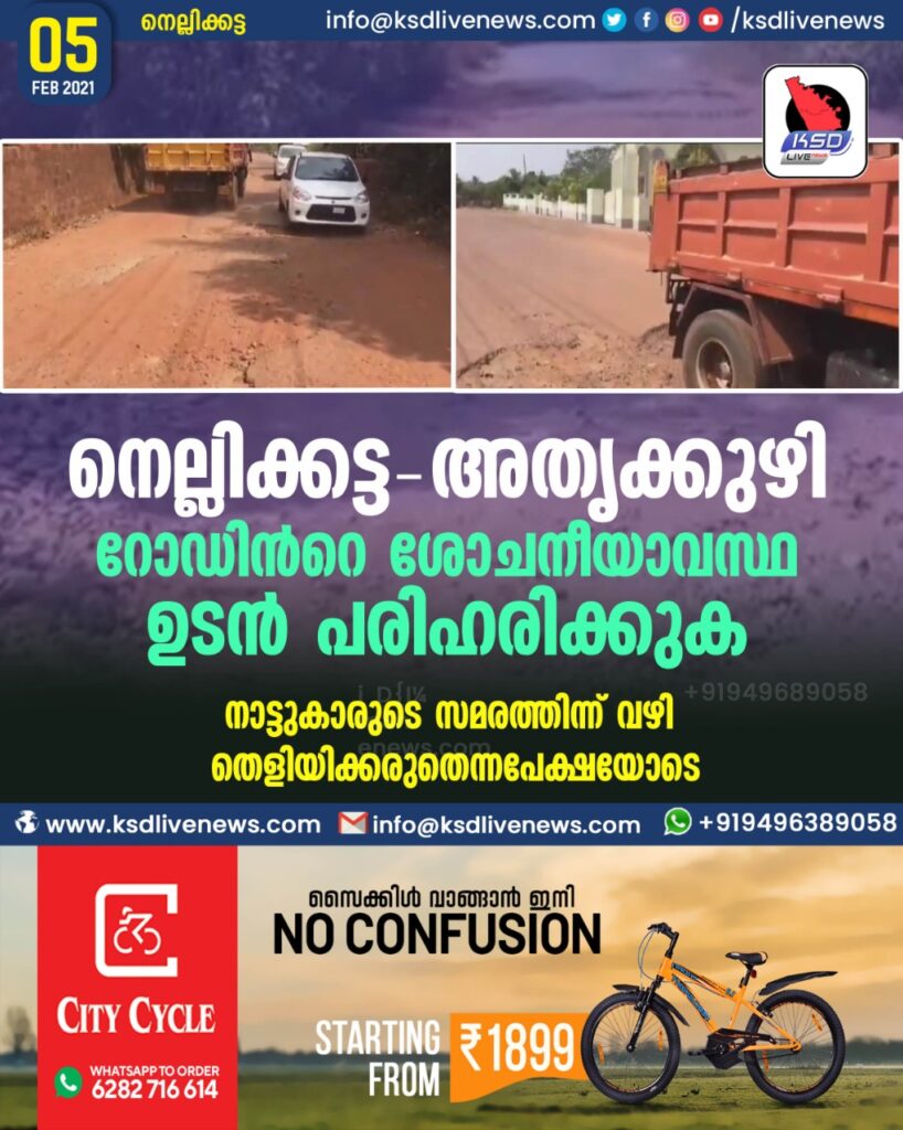 നെല്ലിക്കട്ട – അതൃകുഴി വഴി നായന്മാരമൂല പോകുന്ന റോഡ് നെല്ലിക്കട്ട മുതൽ അതൃകുഴി വരെ 3 കിലോമീറ്റർ റോഡ് പൂർണമായും തകർന്നു 7 വർഷം പിന്നിടുന്നു. കാസർകോട് ടൗണിൽ പോവാൻ നൂർ കണക്കിന് ജനങ്ങൾ ഉപയോഗിക്കുന്ന റോഡയാണ് യാത്ര ദുരിതം അനുഭവിക്കുന്നത്. റോഡിന്റെ ശോചനീയാവസ്ഥ പരിഹരിക്കനമെന്ന് ആവശ്യപ്പെട്ട് നാട്ടുകാർ റോഡ് ഉപരോധിച്ചു പ്രതിഷേധിക്കാനുള്ള തയ്യാറുടുപ്പിലാണ്. ജില്ലാ പഞ്ചായത്തിന്റെ അധികാര പരിധിയിൽ വരുന്ന റോഡയാണ്.