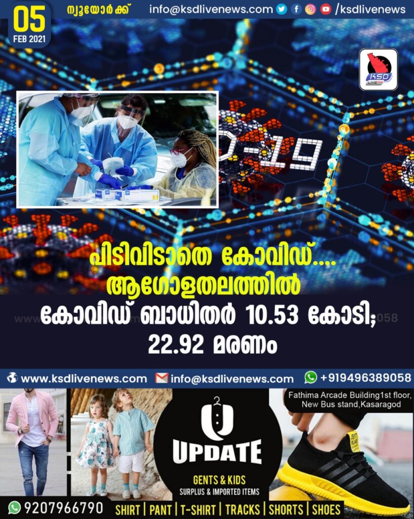 ആഗോളതലത്തിൽ കോവിഡ് ബാധിതർ 10.53 കോടി; 22.92 മരണം