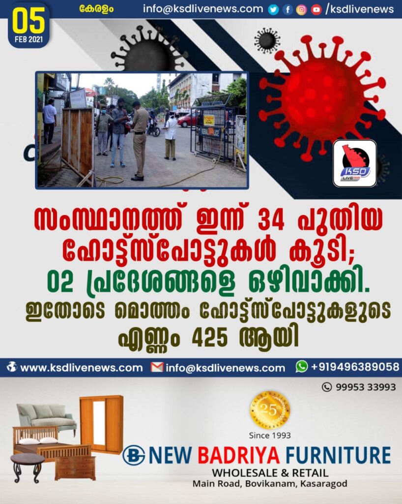 സംസ്ഥാനത്ത് ഇന്ന് 34 പുതിയ ഹോട്ട്സ്പോട്ടുകള് കൂടി; 02 പ്രദേശങ്ങളെ ഒഴിവാക്കി. ഇതോടെ മൊത്തം ഹോട്ട്സ്പോട്ടുകളുടെ എണ്ണം 425 ആയി.SHARE THIS ONഇന്ന് 34 പുതിയ ഹോട്ട് സ്പോട്ടുകളാണുള്ളത്. 2 പ്രദേശങ്ങളെ ഹോട്ട് സ്പോട്ടില് നിന്നും ഒഴിവാക്കി. നിലവില് ആകെ 425 ഹോട്ട് സ്പോട്ടുകളാണുള്ളത്
