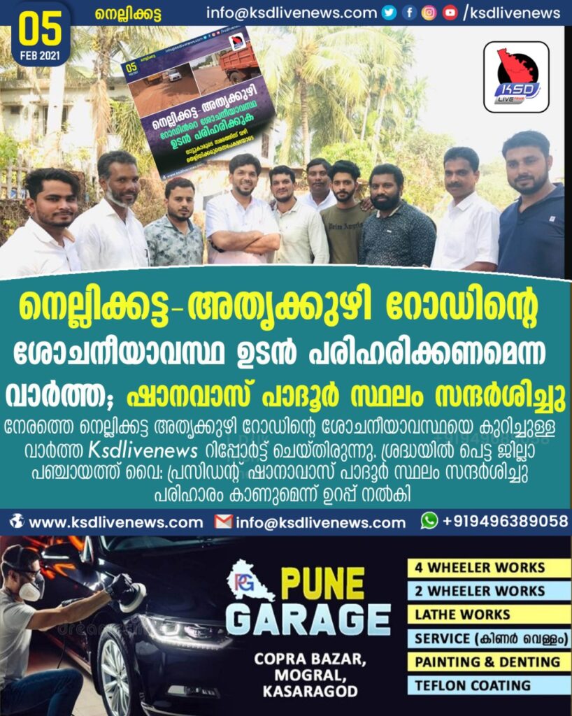 നെല്ലിക്കട്ട – അതൃകുഴി നായന്മാരമൂല വഴി കാസറഗോഡ് പോകുന്ന റോഡ്, നെല്ലിക്കട്ട മുതൽ അതൃകുഴി വരെ 3 കിലോമീറ്ററോളം റോഡ് പൂർണമായും തകർന്നു 7 വർഷം പിന്നിടുന്നു. കാസർകോട് ടൗണിൽ പോവാൻ നൂറു കണക്കിന് ജനങ്ങൾ ഉപയോഗിക്കുന്ന റോഡാണ് യാത്ര ദുരിതം അനുഭവിക്കുന്നത്. റോഡിന്റെ ശോചനീയാവസ്ഥ പരിഹരിക്കണമെന്ന് ആവശ്യപ്പെട്ട് ksdlivenews ന്യൂസ് മുഖേനയും, നാട്ടുകാർ സോഷ്യൽ മീഡിയ വഴിയും മറ്റും ശക്തമായ പ്രധിഷേധം ഉയർത്തിയിരുന്നു. ഇന്ന് ശോചനീയാസ്ഥയെ കുറിച്ച് ksdlivenews വാർത്ത റിപ്പോർട്ട് ചെയ്തിരുന്നു. ഇത് ശ്രദ്ധയിൽ പെട്ട ജില്ലാ പഞ്ചായത്ത് വൈസ് പ്രസിഡന്റ് ഷാനവാസ് പാദൂർ ഇന്ന് ഉച്ചക്ക് നേരിട്ട് റോഡിലെത്തി നാട്ടുകാരുമായി സംസാരിച്ചു. റോഡിന്റെ ദുരവസ്ഥ ബോധ്യപ്പെട്ടതായും അടുത്ത സാമ്പത്തിക ബഡ്ജറ്റിൽ ആവശ്യമായ ഫണ്ട് നീക്കി വെക്കാൻ സാധ്യമായതെല്ലാം ചെയ്യുമെന്ന് ഷാനവാസ് നാട്ടുകാർക്ക് ഉറപ്പ് നൽകി.