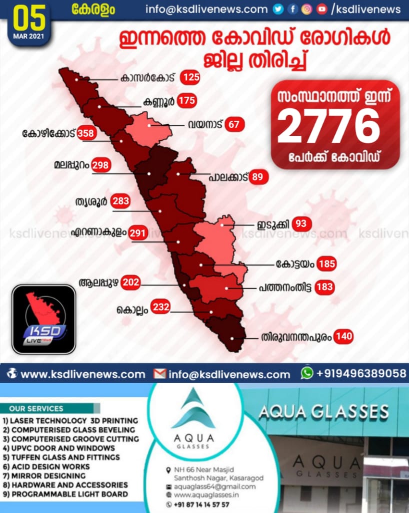 സംസ്ഥാനത്ത് ഇന്ന് 2776 പേര്ക്ക് കോവിഡ്-19 സ്ഥിരീകരിച്ചു. കോഴിക്കോട് 358, മലപ്പുറം 298, എറണാകുളം 291, തൃശൂര് 283, കൊല്ലം 232, ആലപ്പുഴ 207, തിരുവനന്തപുരം 190, കോട്ടയം 185, പത്തനംതിട്ട 183, കണ്ണൂര് 175, കാസര്ഗോഡ് 125, ഇടുക്കി 93, പാലക്കാട് 89, വയനാട് 67 എന്നിങ്ങനേയാണ് ജില്ലകളില് ഇന്ന് രോഗ ബാധ സ്ഥിരീകരിച്ചത്.