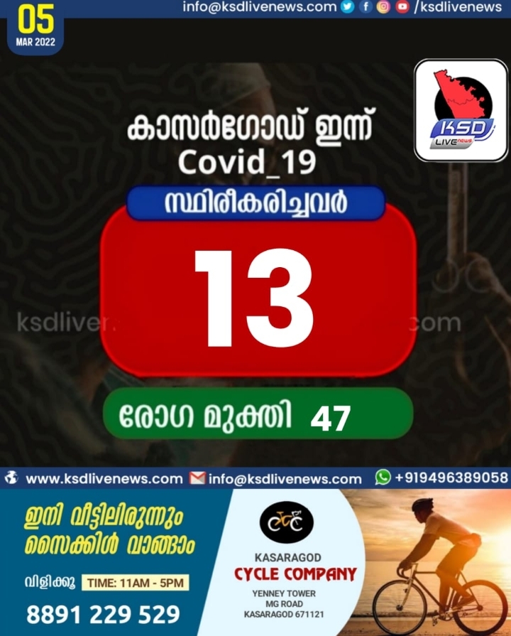 കാസര്കോട് 13 ജില്ലയിൽ പേർ കൂടി കോവിഡ്-19 പോസിറ്റീവായി. ചികിത്സയിലുണ്ടായിരുന്ന 47