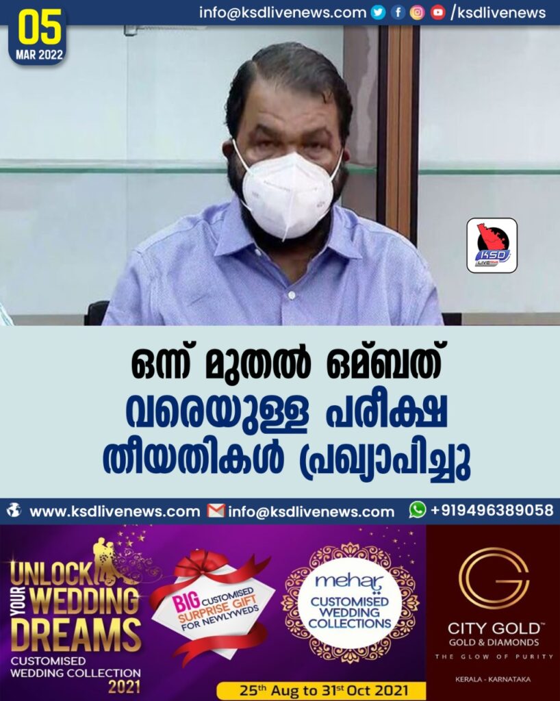 ഒന്ന് മുതല് ഒമ്ബത് വരെയുള്ള പരീക്ഷ തീയതികള് പ്രഖ്യാപിച്ചു