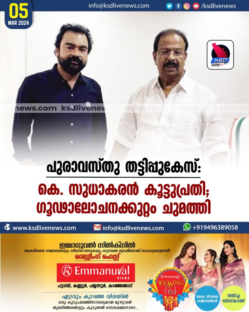 പുരാവസ്തു തട്ടിപ്പുകേസ്: കെ. സുധാകരന് കൂട്ടുപ്രതി; ഗൂഢാലോചനക്കുറ്റം ചുമത്തി