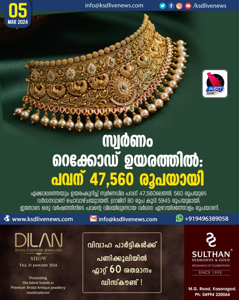 സ്വര്ണം റെക്കോഡ് ഉയരത്തില്: പവന് 47,560 രൂപയായി,