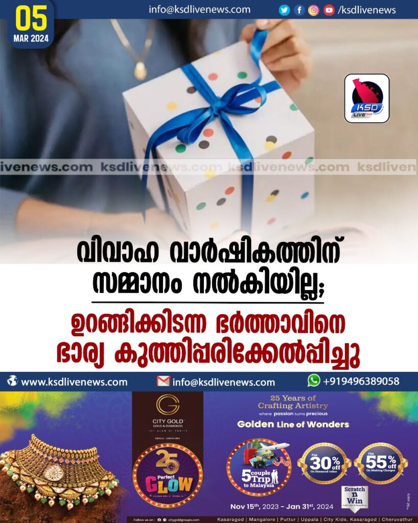 വിവാഹ വാര്‍ഷികത്തിന് സമ്മാനം നല്‍കിയില്ല;  ഉറങ്ങിക്കിടന്ന ഭര്‍ത്താവിനെ ഭാര്യ കുത്തിപ്പരിക്കേല്‍പ്പിച്ചു