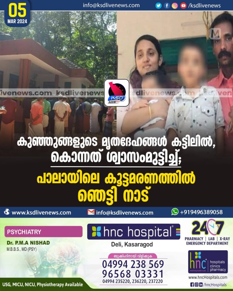 കുഞ്ഞുങ്ങളുടെ മൃതദേഹങ്ങള് കട്ടിലില്, കൊന്നത് ശ്വാസംമുട്ടിച്ച്; പാലായിലെ കൂട്ടമരണത്തില് ഞെട്ടി നാട്