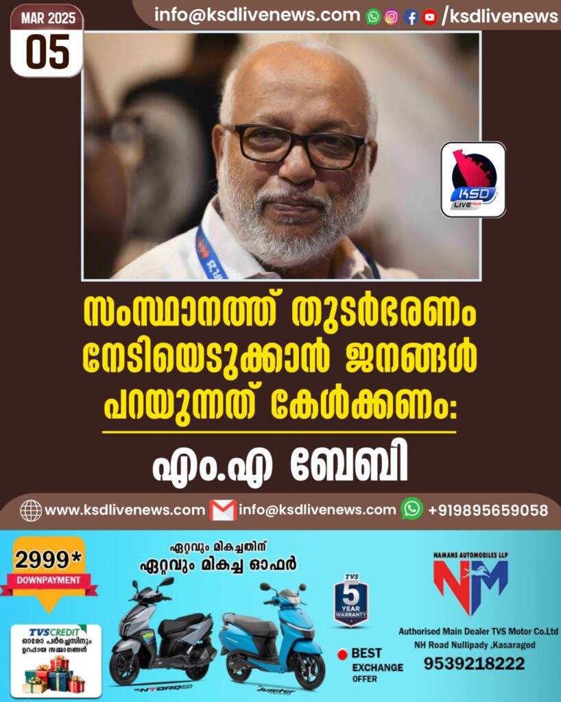 ‘2025 മാര്‍ച്ചില്‍ സംസ്ഥാന സമ്മേളനം ഇവിടെ നടന്ന് ഒരു വര്‍ഷം കഴിയുമ്പോള്‍ നിയമസഭാ തിരഞ്ഞെടുപ്പാണ്. 1995-ലെ സംസ്ഥാന സമ്മേളനം കൊല്ലത്ത് കഴിഞ്ഞ് 96-ൽ ഇടതുപക്ഷജനാധിപത്യ പ്രസ്ഥാനത്തിന് ജയിക്കാന്‍ കഴിഞ്ഞിരുന്നു. എന്നാൽ, 96-ലെ പോലെ അല്ല 2026. ഇപ്പോൾ തുടർഭരണം നടക്കുമ്പോഴാണ് ഇവിടെ സംസ്ഥാന സമ്മേളനം നടക്കുന്നത്. ആ തുടർഭരണത്തിന് വീണ്ടുമൊരു തുടർച്ച നേടിയൊടുക്കാൻ കഴിയുന്ന ചർച്ചകളും തീരുമാനങ്ങളും സംസ്ഥാന സമ്മേളനത്തിൽ നടക്കുമോ എന്നാണ് നമ്മൾ ഉറ്റുനോക്കുന്നത്’, എം.എ. ബേബി പറഞ്ഞു.