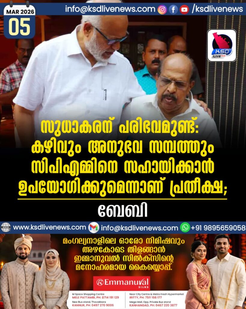 സുധാകരന് പരിഭവമുണ്ട്: കഴിവും അനുഭവ സമ്പത്തും സിപിഎമ്മിനെ സഹായിക്കാൻ ഉപയോഗിക്കുമെന്നാണ് പ്രതീക്ഷ; ബേബി