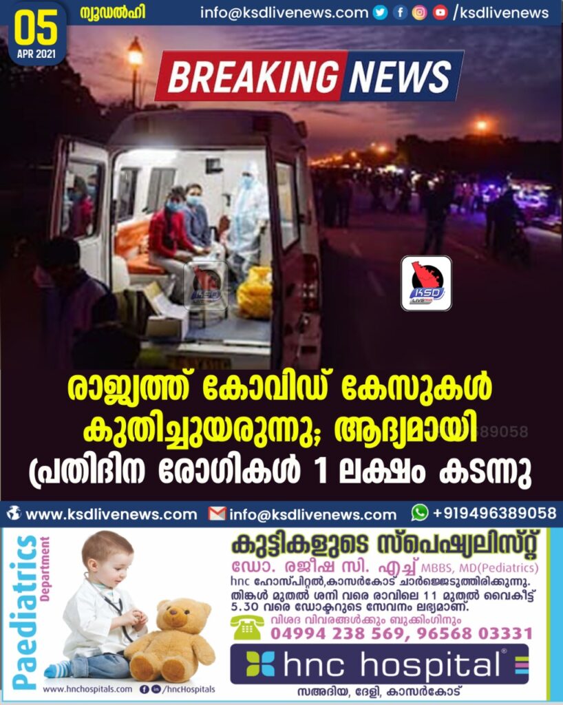 രാജ്യത്ത് കോവിഡ് കേസുകള് കുതിച്ചുയരുന്നു; ആദ്യമായി പ്രതിദിന രോഗികള് 1 ലക്ഷം കടന്നു