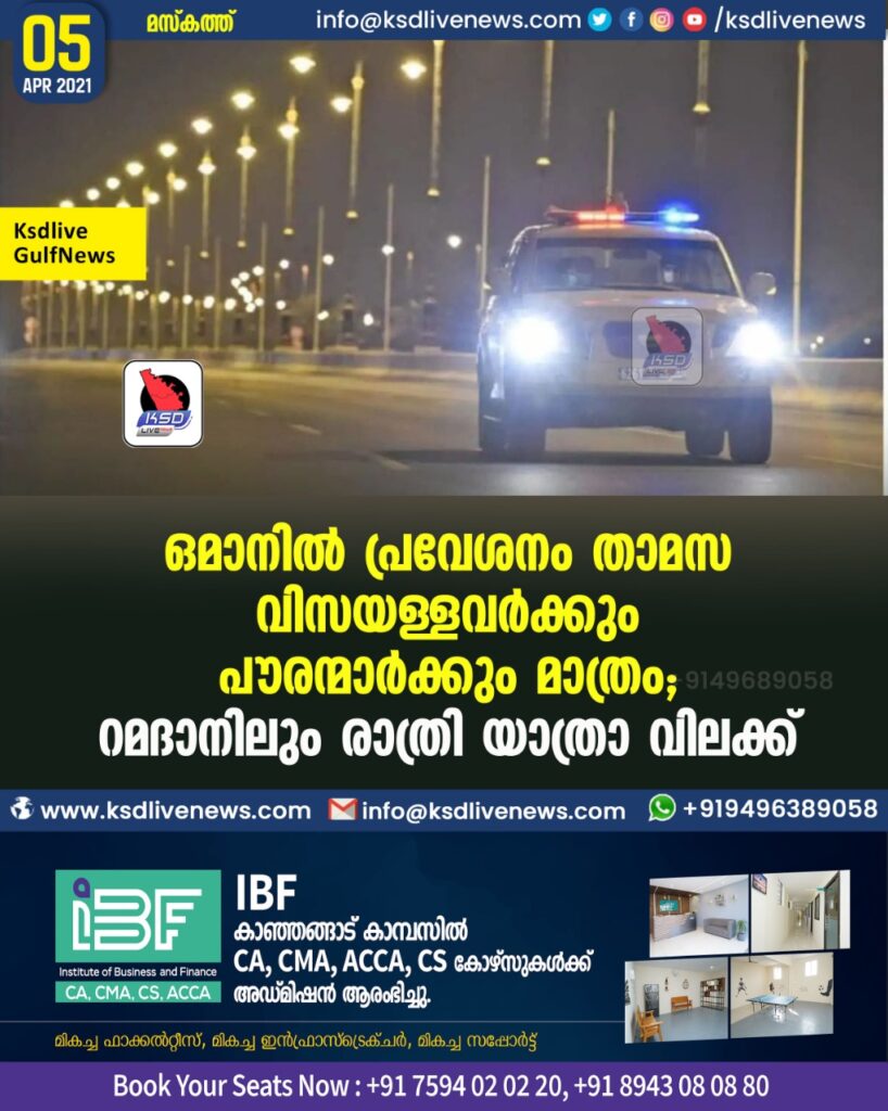 ഒമാനില് പ്രവേശനം താമസ വിസയള്ളവര്ക്കും പൗരന്മാര്ക്കും മാത്രം; റമദാനിലും രാത്രി യാത്രാ വിലക്ക്
