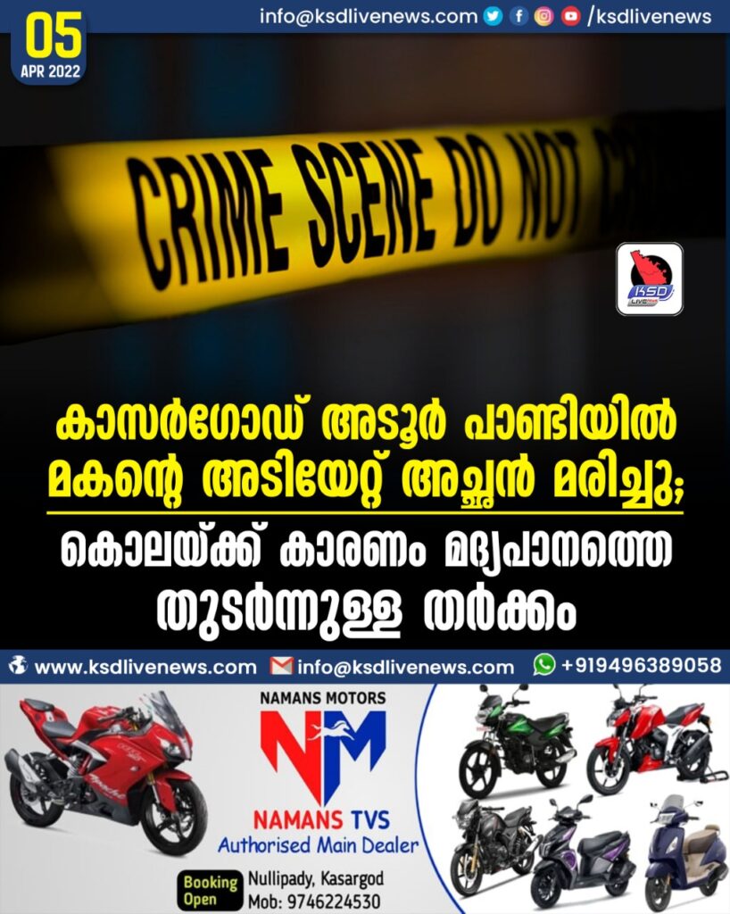 കാസർഗോഡ് അടൂര് പാണ്ടിയില് മകന്റെ അടിയേറ്റ് അച്ഛന് മരിച്ചു ; കൊലയ്ക്ക് കാരണം മദ്യപാനത്തെ തുടര്ന്നുള്ള തര്ക്കം