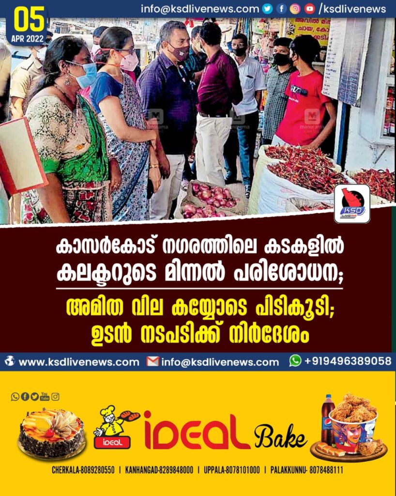 കാസർകോട് നഗരത്തിലെ കടകളിൽ കലക്ടറുടെ മിന്നൽ പരിശോധന; അമിത വില കയ്യോടെ പിടികൂടി; ഉടൻ നടപടിക്ക് നിർദേശം