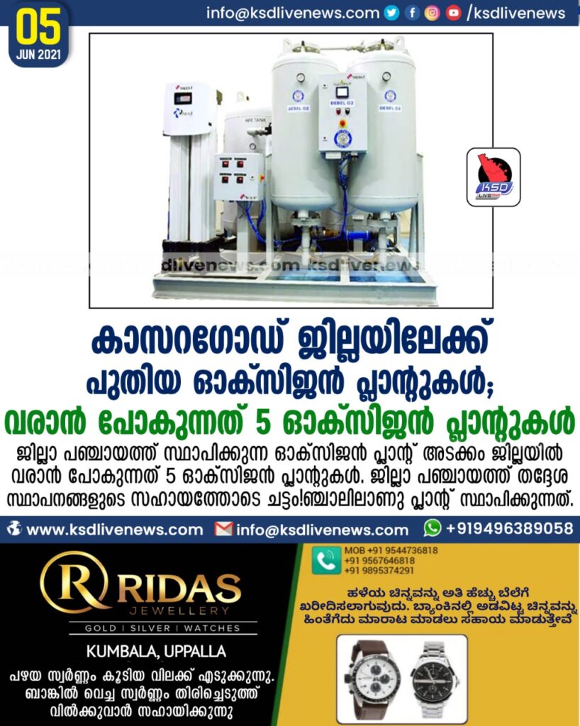 കാസറഗോഡ് ജില്ലയിലേക്ക് പുതിയ ഓക്സിജൻ പ്ലാന്റുകൾ; വരാൻ പോകുന്നത് 5 ഓക്സിജൻ പ്ലാന്റുകൾ