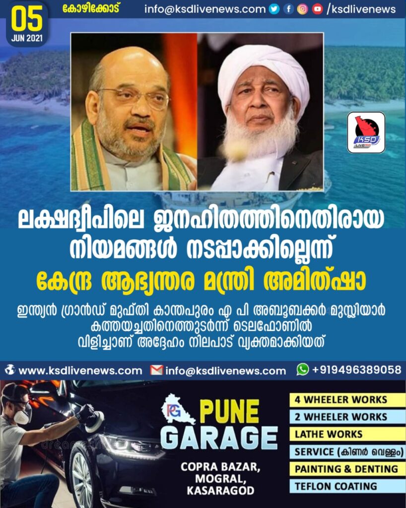 കോഴിക്കോട് : ലക്ഷദ്വീപിലെ ജനങ്ങളുടെ ഹിതത്തിനെതിരായ നിയമങ്ങള്‍ നടപ്പാക്കില്ലെന്ന് കേന്ദ്ര ആഭ്യന്തര മന്ത്രി അമിത്ഷാ. ഇന്ത്യന്‍ ഗ്രാന്‍ഡ് മുഫ്തി കാന്തപുരം എ പി അബൂബക്കര്‍ മുസ്‌ലിയാരെ ടെലിഫോണില്‍ വിളിച്ചാണ് അമിത്ഷാ ഇക്കാര്യം അറിയിച്ചത്. ലക്ഷദീപിലെ അഡ്മിനിസ്‌ട്രേറ്റര്‍ പ്രഫുല്‍ ഖോഡ പട്ടേല്‍ കൊണ്ടുവന്ന നിയമങ്ങള്‍ ദീപ് വാസികളുടെ ജീവിതത്തിനും സംസ്‌കാരത്തിനും ഭീഷണി ഉയര്‍ത്തുന്നതാണെന്നും കേന്ദ്രസര്‍ക്കാര്‍ ഇടപെടണമെന്നും ആവശ്യപ്പെട്ട് കാന്തപുരം അമിത്ഷാക്ക് കത്ത് നല്‍കിയിരുന്നു. ഇത് വായിച്ച ശേഷമാണ് അദ്ദേഹം നേരില്‍ വിളിച്ച് നിലപാട് വ്യക്തമാക്കിയത്.