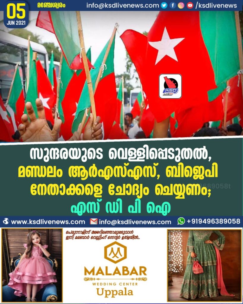 സുന്ദരയുടെ വെള്ളിപ്പെടുതൽ, മണ്ഡലം ആർ എസ് എസ് -ബി ജെ പി നേതാക്കളെ ചോദ്യം ചെയ്യണം: എസ് ഡി പി ഐ