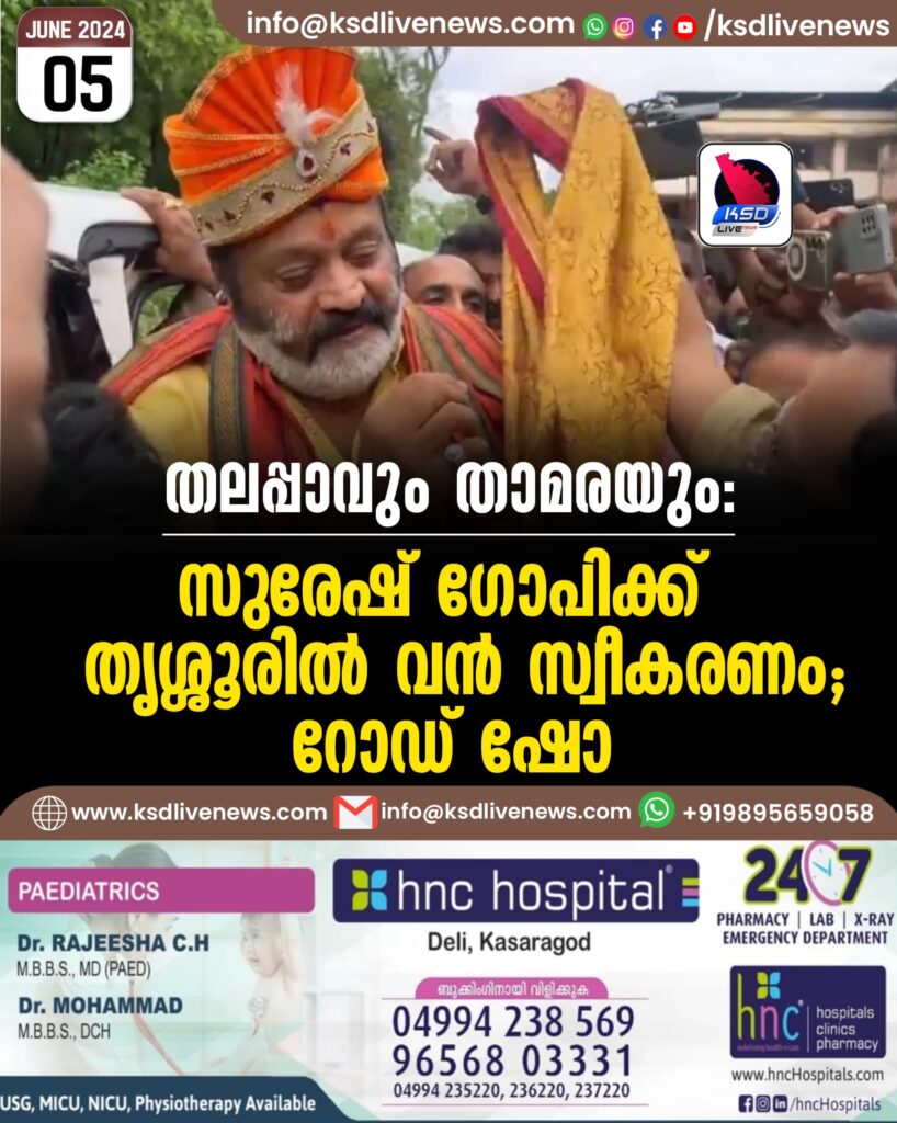 തലപ്പാവും താമരയും: സുരേഷ് ഗോപിക്ക് തൃശ്ശൂരില് വന് സ്വീകരണം; റോഡ് ഷോ