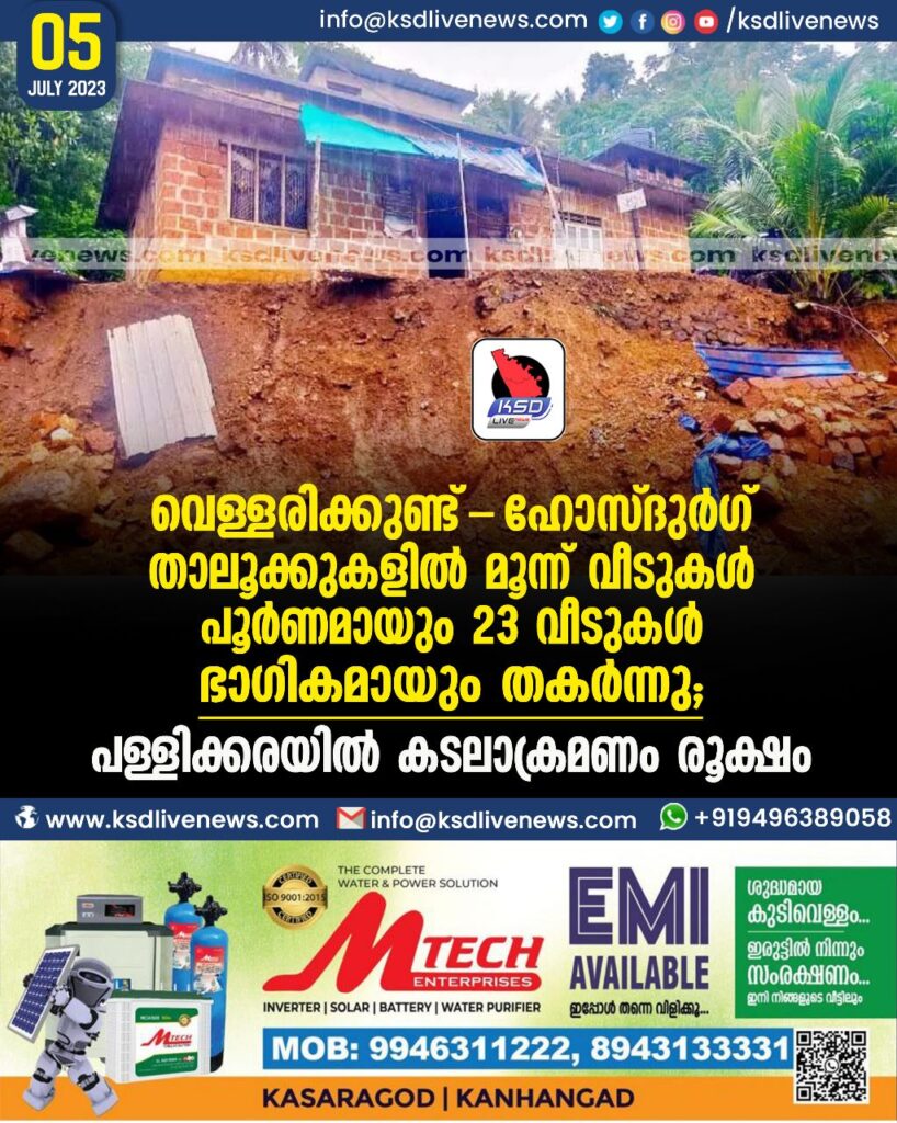 വെള്ളരിക്കുണ്ട്- ഹോസ്ദുർഗ് താലൂക്കുകളിൽ മൂന്ന് വീടുകൾ പൂർണമായും 23 വീടുകൾ ഭാഗികമായും തകർന്നു; പള്ളിക്കരയിൽ കടലാക്രമണം രൂക്ഷം