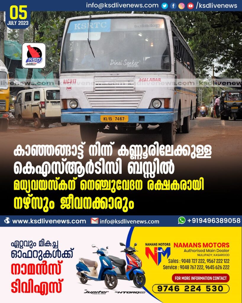 കാഞ്ഞങ്ങാട്ട് നിന്ന് കണ്ണൂരിലേക്കുള്ള കെ.എസ്.ആർ.ടി.സി.ബസ്സിൽ മധ്യവയസ്കന് നെഞ്ചുവേദന രക്ഷകരായി നഴ്സും ജീവനക്കാരും