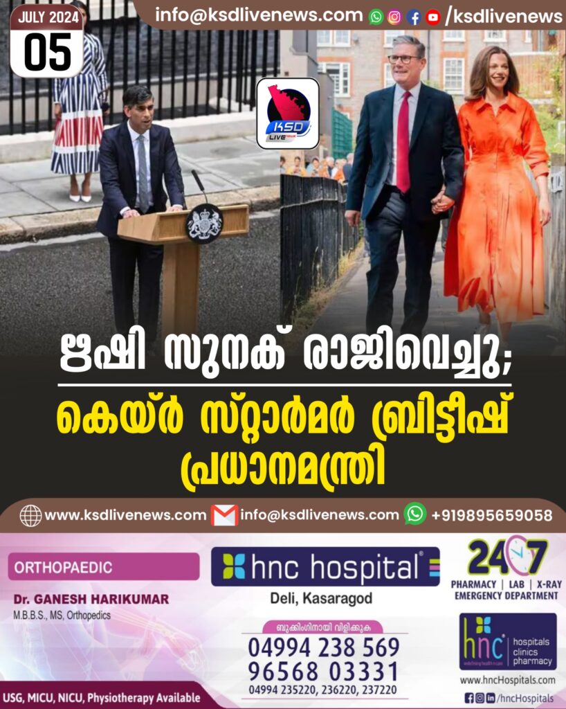 ഋഷി സുനക് രാജിവെച്ചു; കെയ്ർ സ്റ്റാർമർ ബ്രിട്ടീഷ് പ്രധാനമന്ത്രി