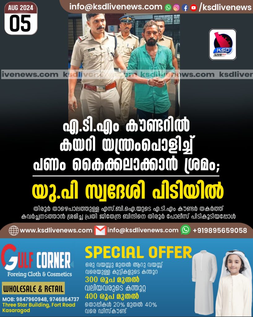തിരൂർ: തിരൂരിൽ എ.ടി.എം. തകർത്ത് പണം കവർച്ചചെയ്യാൻ ശ്രമം. യു.പി സ്വദേശി പിടിയിൽ. താഴെപാലത്ത് ബാങ്ക് കെട്ടിടത്തോടുചേർന്നുള്ള എസ്.ബി.ഐ.യുടെ എ.ടി.എം. കൗണ്ടറിൽ ഞായറാഴ്ച പുലർച്ചെയാണ് മോഷണശ്രമം. ഇപ്പോൾ പുത്തനത്താണിയിൽ താമസിക്കുന്ന ജിതേന്ദ്ര ബിന്ദ് (33) ആണ് പിടിയിലായത്.