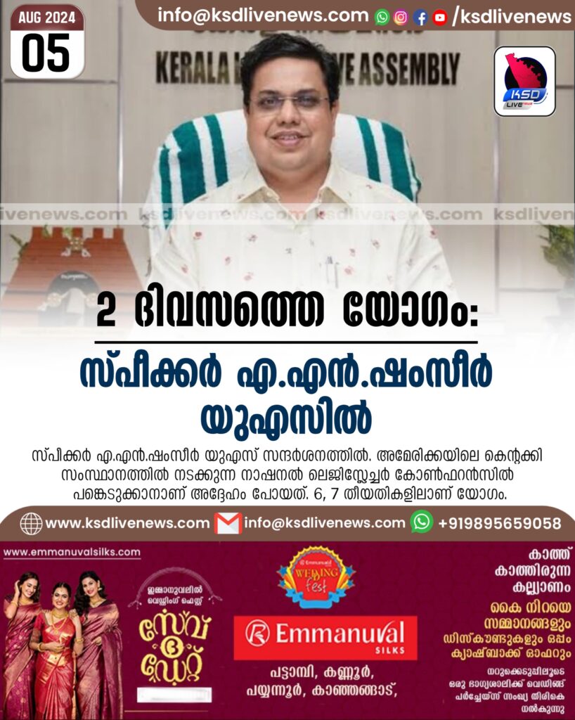 തിരുവനന്തപുരം: സ്പീക്കർ എ.എൻ.ഷംസീർ യുഎസ് സന്ദർശനത്തിൽ. അമേരിക്കയിലെ കെന്റക്കി സംസ്ഥാനത്തിൽ നടക്കുന്ന നാഷനൽ ലെജിസ്ലേച്ചർ കോൺഫറൻസിൽ പങ്കെടുക്കാനാണ് അദ്ദേഹം പോയത്. 6, 7 തീയതികളിലാണ് യോഗം.