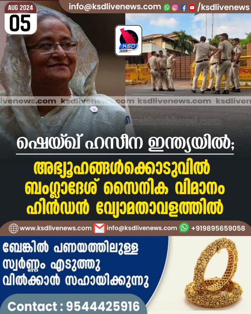 ഷെയ്ഖ് ഹസീന ഇന്ത്യയിൽ; അഭ്യൂഹങ്ങൾക്കൊടുവിൽ ബംഗ്ലാദേശ് സൈനികവിമാനം ഹിൻഡൻ വ്യോമതാവളത്തിൽ