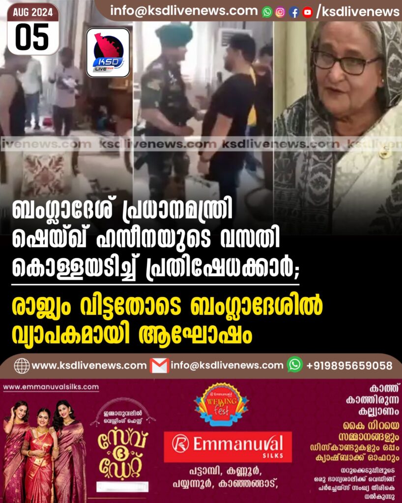 ബംഗ്ലാദേശ് പ്രധാനമന്ത്രി ഷെയ്ഖ് ഹസീനയുടെ വസതി കൊള്ളയടിച്ച് പ്രതിഷേധക്കാര്; രാജ്യം വിട്ടതോടെ ബംഗ്ലാദേശിൽ വ്യാപകമായി ആഘോഷം/വീഡിയോ