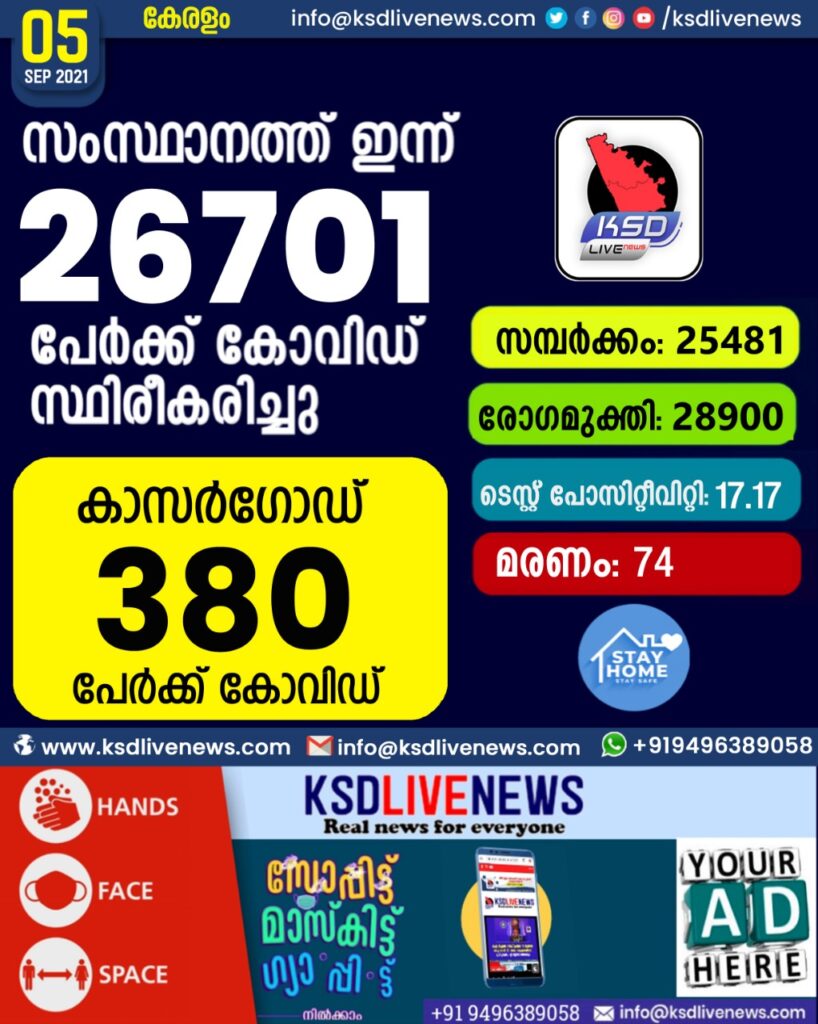 സംസ്ഥാനത്ത് ഇന്ന് 26,701 പേർക്ക് കോവിഡ് സ്ഥിരീകരിച്ചു. സമ്പർക്കം വഴി 25,481 പേർക്കും ; ആശ്വാസമായി 28,900 പേർക്ക് രോഗ മുക്തിയും ; കാസർഗോഡ് ജില്ലയിൽ 380 പേർക്ക് പുതിയ കോവിഡ് കേസുകൾ ; മരണം 74