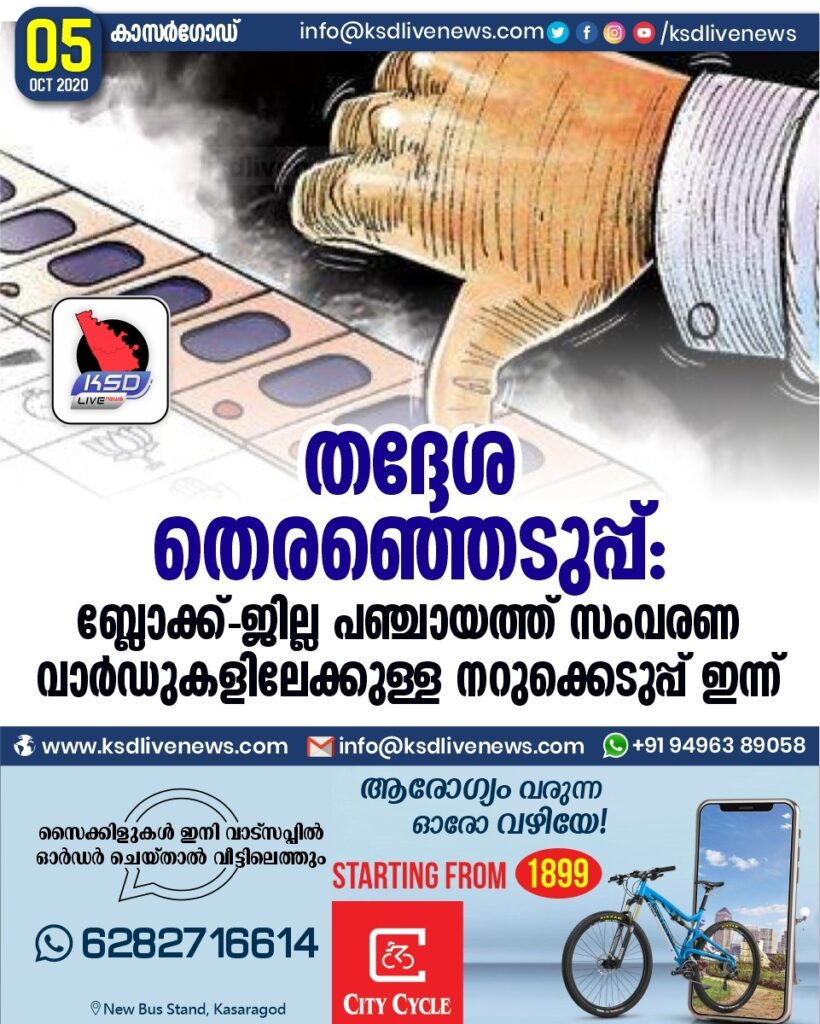 തദ്ദേശ തെരഞ്ഞെടുപ്പ്: ബ്ലോക്ക്-ജില്ല പഞ്ചായത്ത് സംവരണ വാര്ഡുകളിലേക്കുള്ള നറുക്കെടുപ്പ് ഇന്ന്