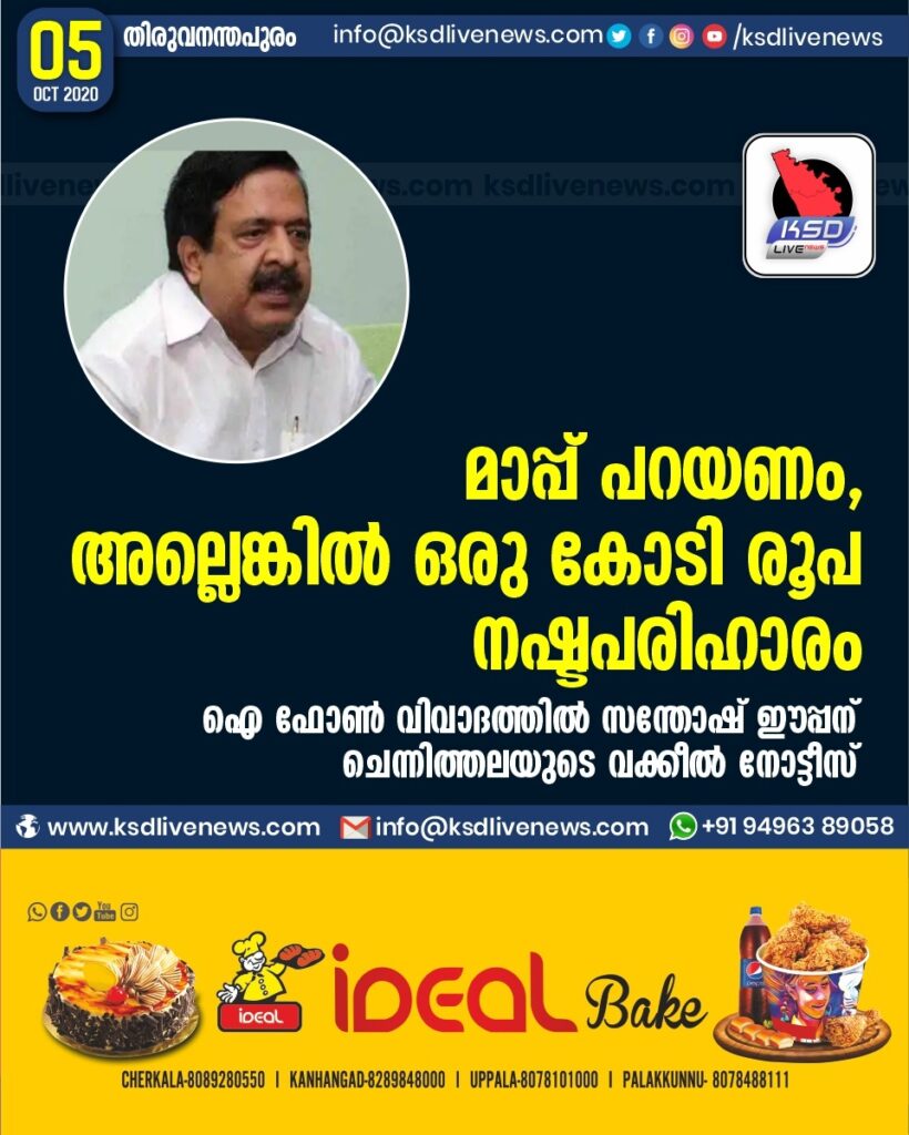 മാപ്പ് പറയണം , അല്ലെങ്കിൽ ഒരുകോടി രൂപ നഷ്ടപരിഹാരം ; ഐ ഫോൺ വിവാദത്തിൽ സന്തോഷ് ഈപ്പന് ചെന്നിത്തലയുടെ വക്കീൽ നോട്ടീസ്