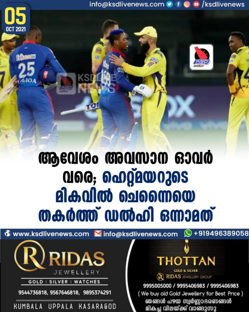 ആവേശം അവസാന ഓവര് വരെ; ഹെറ്റ്മയറുടെ മികവില് ചെന്നൈയെ തകര്ത്ത് ഡല്ഹി ഒന്നാമത്