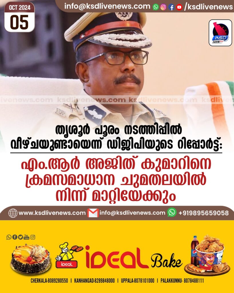 തൃശൂര്‍ പൂരം നടത്തിപ്പില്‍ വീഴ്ചയുണ്ടായെന്ന് ഡിജിപിയുടെ റിപ്പോര്‍ട്ട്: എംആര്‍ അജിത് കുമാറിനെ ക്രമസമാധാന ചുമതലയില്‍ നിന്ന് മാറ്റിയേക്കും