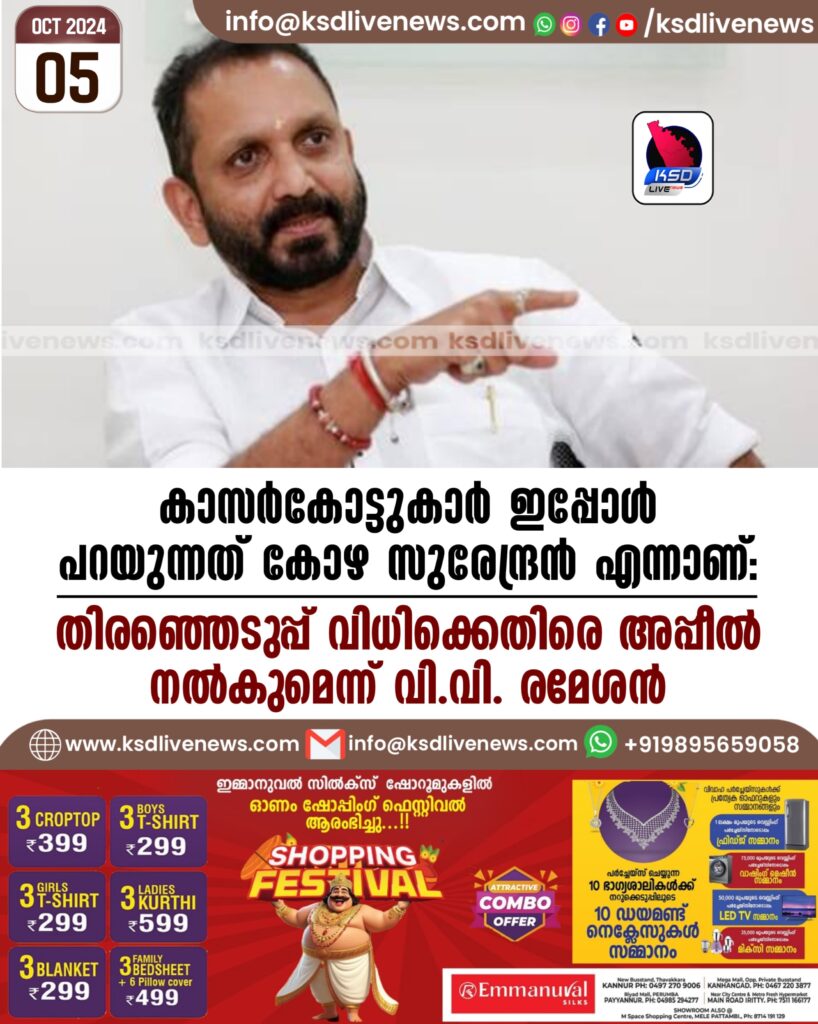 കാസർകോട്ടുകാർ ഇപ്പോൾ പറയുന്നത് കോഴ സുരേന്ദ്രൻ എന്നാണ്: തിരഞ്ഞെടുപ്പ് വിധിക്കെതിരെ അപ്പീൽ നൽകുമെന്ന് വി.വി. രമേശൻ