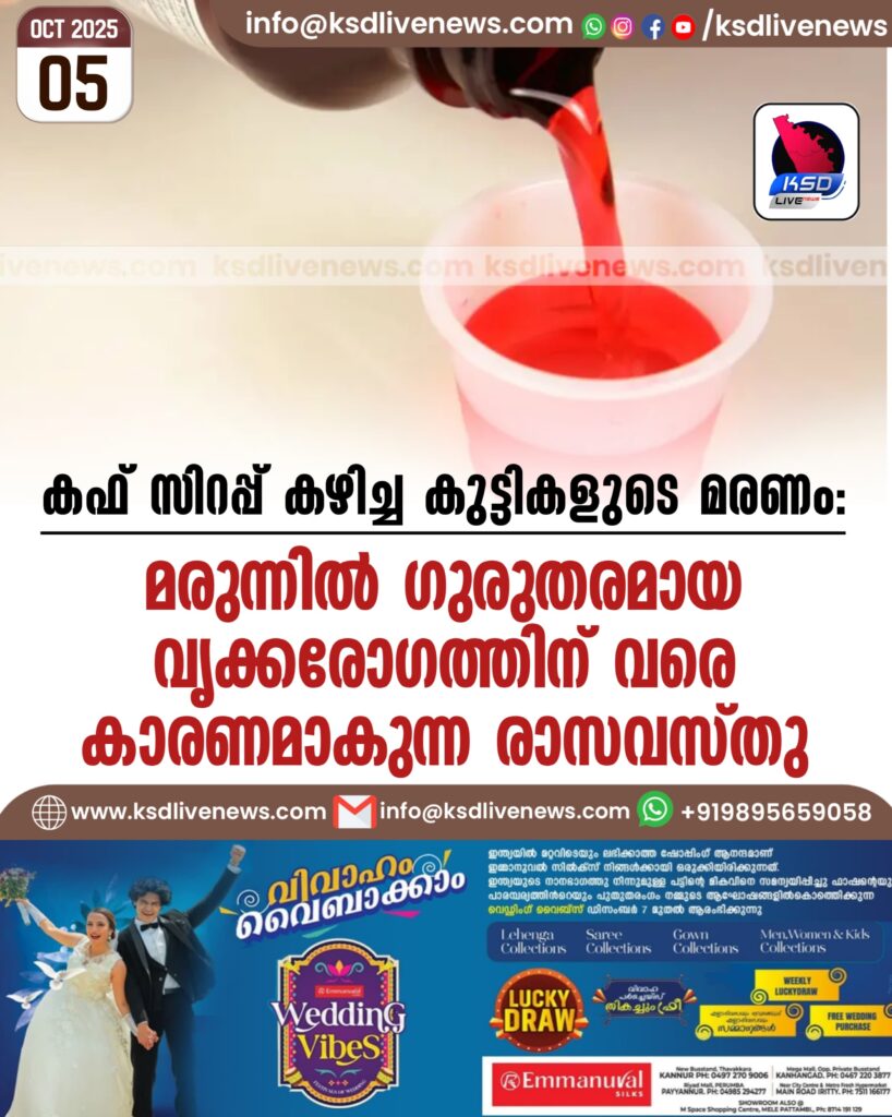 കഫ് സിറപ്പ് കഴിച്ച കുട്ടികളുടെ മരണം: മരുന്നിൽ ഗുരുതരമായ വൃക്കരോഗത്തിന് വരെ കാരണമാകുന്ന രാസവസ്തു