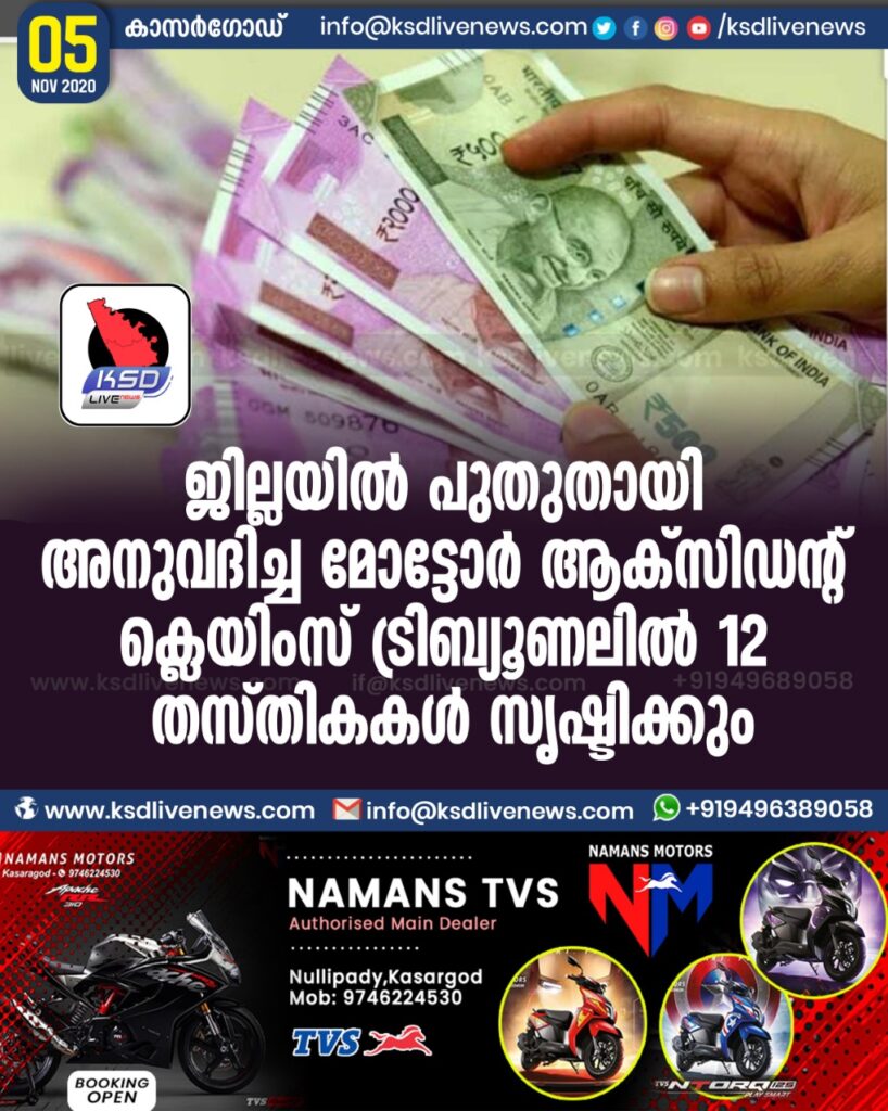 ജില്ലയിൽ പുതുതായി അനുവദിച്ച മോട്ടോർ ആക്സിഡന്റ് ക്ലെയിംസ് ട്രിബ്യൂണലിൽ 12 തസ്തികകൾ സൃഷ്ടിക്കും
