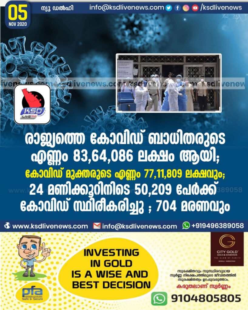 രാജ്യത്ത കോവിഡ് ബാധിതരുടെ എണ്ണം 83,64,086 ലക്ഷം ആയി ; കോവിഡ് മുക്തരുടെ എണ്ണം 77,11,809 ലക്ഷവും ;