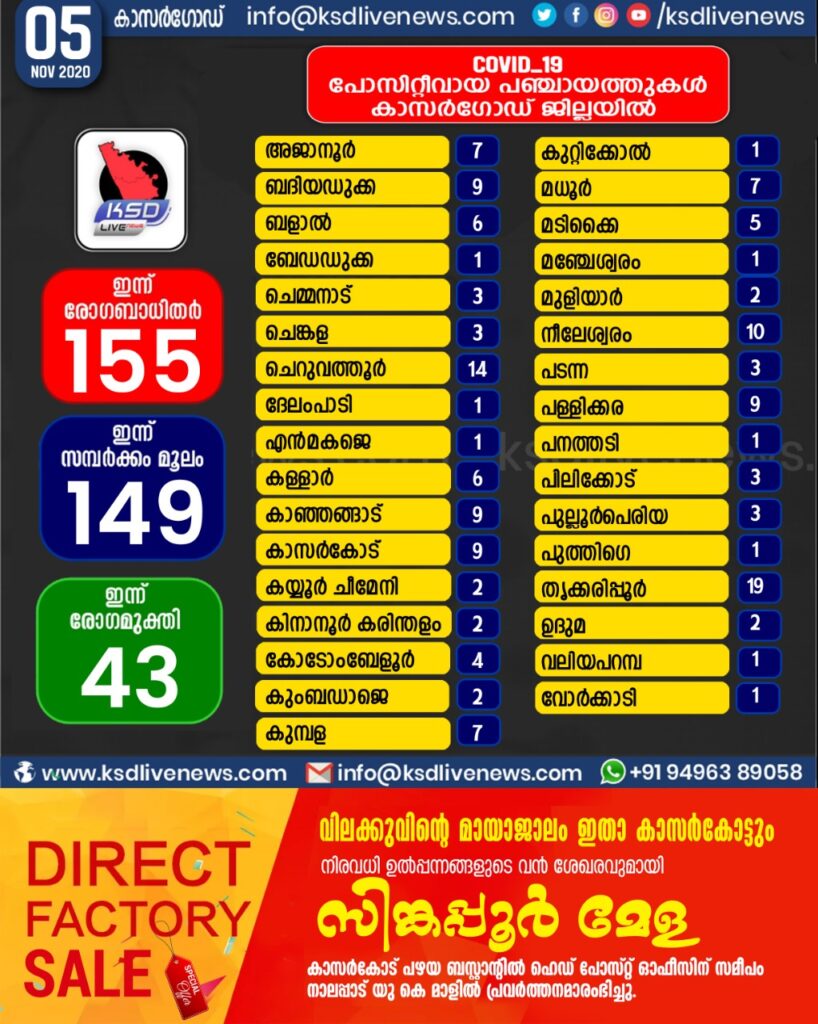 കാസർഗോഡ് ജില്ലയിൽ ഇന്ന് കോവിഡ് പോസിറ്റീവായവരുടെ പഞ്ചായത്ത് തിരിച്ചുള്ള സ്ഥിതി വിവര കണക്ക്