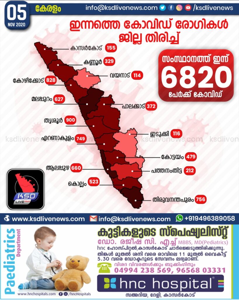 തിരുവനന്തപുരം: കേരളത്തില് ഇന്ന് 6820 പേര്ക്ക് കോവിഡ്-19 സ്ഥിരീകരിച്ചതായി ആരോഗ്യ വകുപ്പ് മന്ത്രി കെ.കെ. ശൈലജ ടീച്ചര് അറിയിച്ചു. തൃശൂര് 900, കോഴിക്കോട് 828, തിരുവനന്തപുരം 756, എറണാകുളം 749, ആലപ്പുഴ 660, മലപ്പുറം 627, കൊല്ലം 523, കോട്ടയം 479, പാലക്കാട് 372, കണ്ണൂര് 329, പത്തനംതിട്ട 212, കാസര്ഗോഡ് 155, ഇടുക്കി 116, വയനാട് 114 എന്നിങ്ങനേയാണ് ജില്ലകളില് ഇന്ന് രോഗ ബാധ സ്ഥിരീകരിച്ചത്.