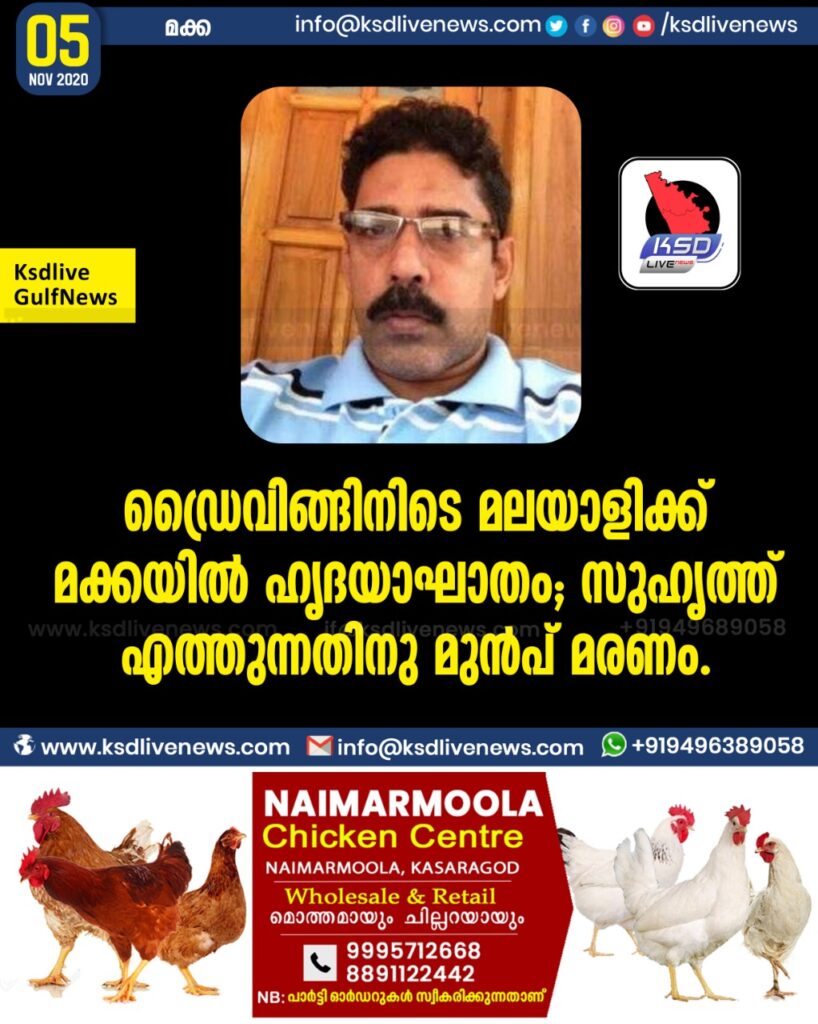 ഡ്രൈവിങ്ങിനിടെ മലയാളിക്ക് മക്കയിൽ ഹൃദയാഘാതം ; സുഹൃത്ത് എത്തുന്നതിനു മുൻപ് മരണം.