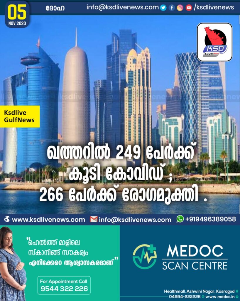 ഖത്തറിൽ 249 പേർക്ക് കൂടി കോവിഡ് ; 266 പേർക്ക് രോഗമുക്തി .