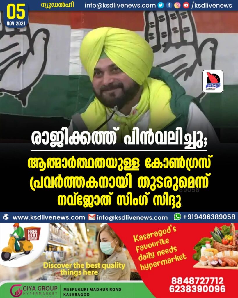 രാജിക്കത്ത് പിൻവലിച്ചു; ആത്മാര്‍ത്ഥതയുള്ള കോണ്‍ഗ്രസ് പ്രവർത്തകനായി തുടരുമെന്ന് നവ്ജോത് സിംഗ് സിദ്ദു