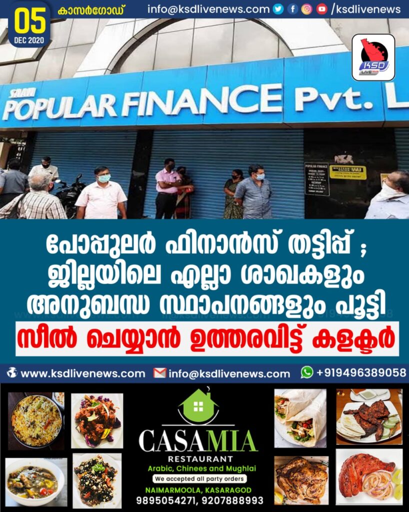 പോപ്പുലർ ഫിനാൻസ് ലിമിറ്റഡിന്റെ ജില്ലയിലെ എല്ലാ ശാഖകളും അനുബന്ധ സ്ഥാപനങ്ങളും അടച്ചു പൂട്ടാൻ കലക്ടർ ഡോ ഡി സജിത് ബാബു ഉത്തരവിട്ടു. സ്ഥാപനങ്ങൾ പൂട്ടി സീൽ ചെയ്യാനും ജില്ലാ പോലീസ് മേധാവിക്ക് നിർദേശം നൽകി. സ്ഥാപനവുമായി ബന്ധപ്പെട്ടവരുടെ സ്വത്തുകൾ ക്രയവിക്രയം ചെയ്യുന്നത് തടയാൻ ജില്ലാ രജിസ്ട്രാറോടും ആവശ്യപ്പെട്ടു.മുഴുവൻ അക്കൗണ്ടും മരവിപ്പിക്കാൻ ജില്ലാ ലീഡ് ബാങ്ക് മാനേജർക്കും ഉത്തരവ് നൽകി.